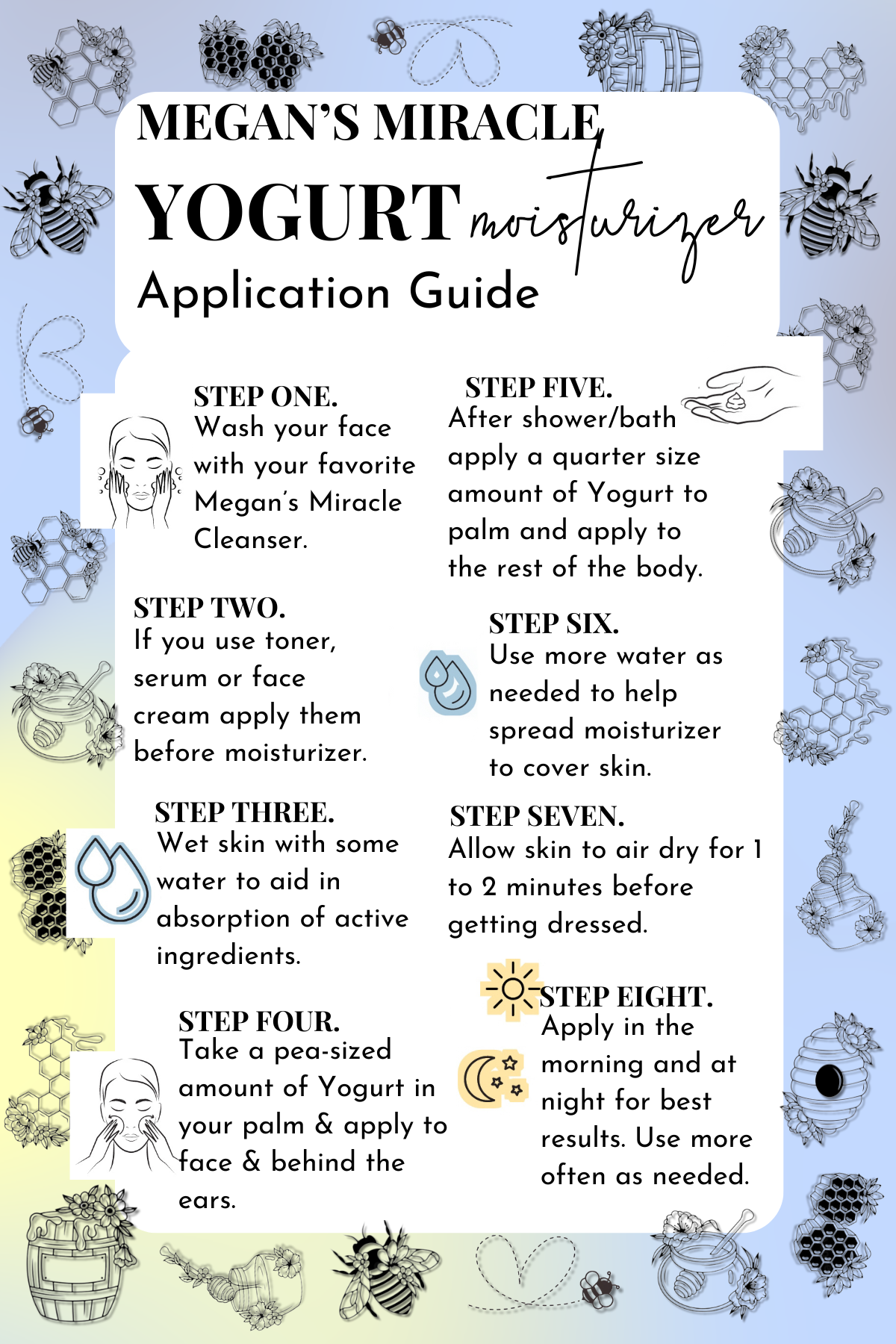 For regular use, apply a dollop of moisturizer to clean, wet skin after your shower or bath. Spread a thin layer of yogurt over face and body 1 time daily or more often as desired.